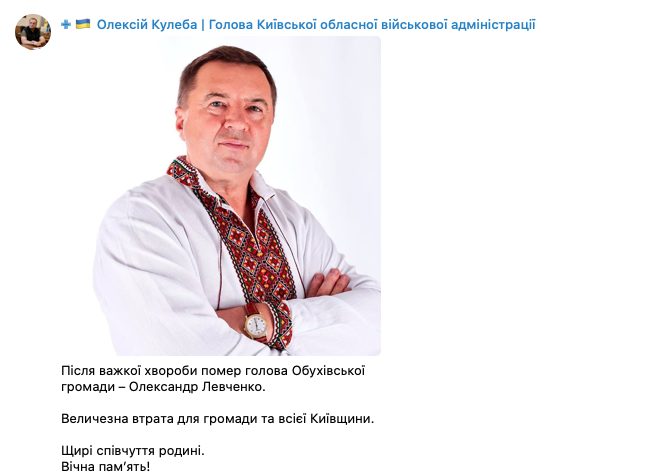 После тяжелой болезни умер мэр Обухова Александр Левченко. Об этом сообщил глава Киевской ОВА Алексей Кулеба в своем телеграм-канале.
