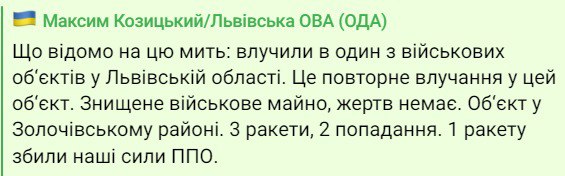 "Объект в Золочевском районе. 3 ракеты, 2 попадания. 1 ракету сбили наши силы ПВО", – написал Козицкий.