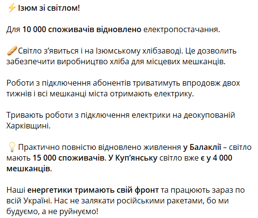 В Изюме Харьковской области появился свет, сообщил замглавы Офиса президента Кирилл Тимошенко. Это позволило запустить производство на Изюмском хлебозаводе.