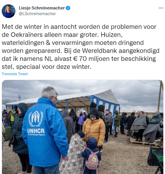 "С приближением зимы проблемы для украинцев только усугубляются. Дома, водопровод и системы отопления нуждаются в срочном ремонте. Объявила Всемирному банку, что я уже выделяю 70 млн евро от имени Нидерландов, специально для этой зимы", - написала она.
