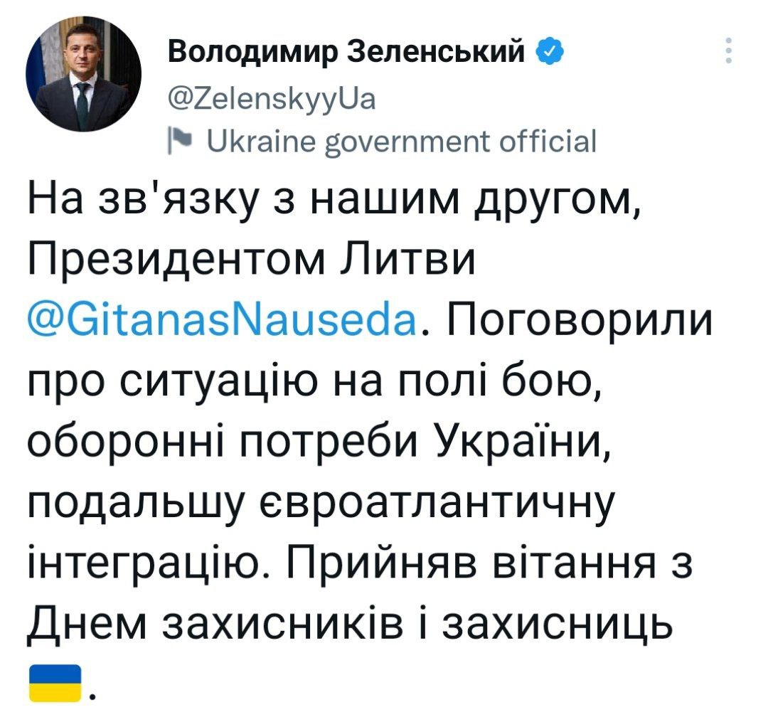 "Поговорили о ситуации на поле боя, оборонных потребностях Украины, дальнейшей евроатлантической интеграции. Принял поздравления с Днем защитников и защитниц", - написал Зеленский.