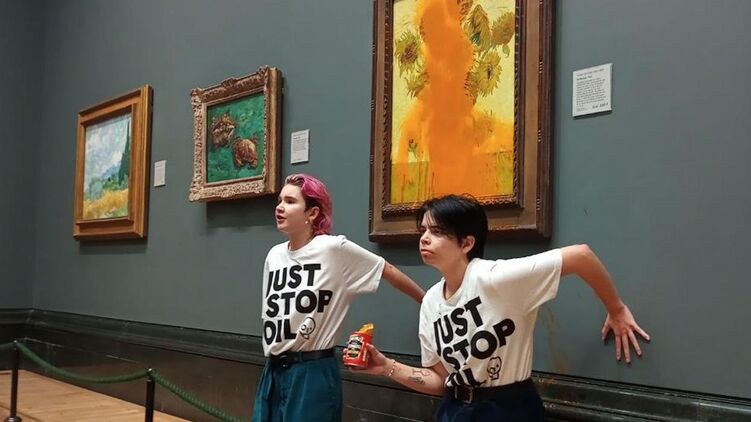 Напомним, две экоактивистки из группы Just Stop Oil облили томатным супом шедевр Винсента Ван Гога "Подсолнухи", находящийся в экспозиции Национальной галереи в Лондоне. Инцидент произошел поздним утром пятницы, 14 октября. На картину, которая оценивается более чем в 84 миллиона долларов США (86 млн евро), вылили две банки супа Heinz.