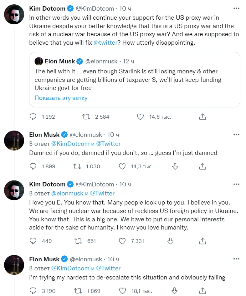 "Другими словами, вы продолжите поддерживать опосредованную войну США в Украине, несмотря на то, что знаете, что это опосредованная война США и риск ядерной войны из-за опосредованной войны США? И мы должны верить, что вы исправите Твиттер? Какое разочарование", - написал Дотком.