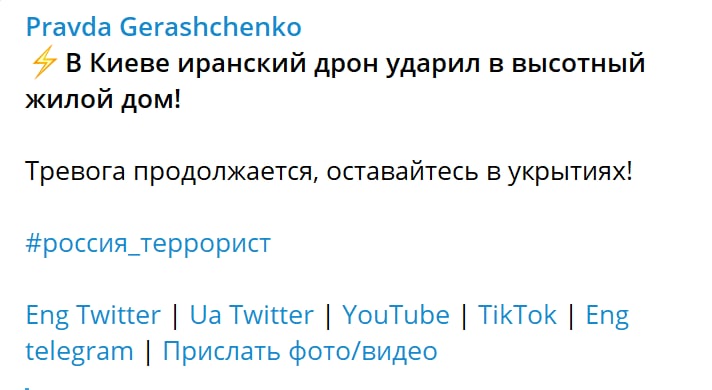 08:45 Советник главы МВД Антон Геращенко пишет, что в Киеве дрон попал в жилую высотку.