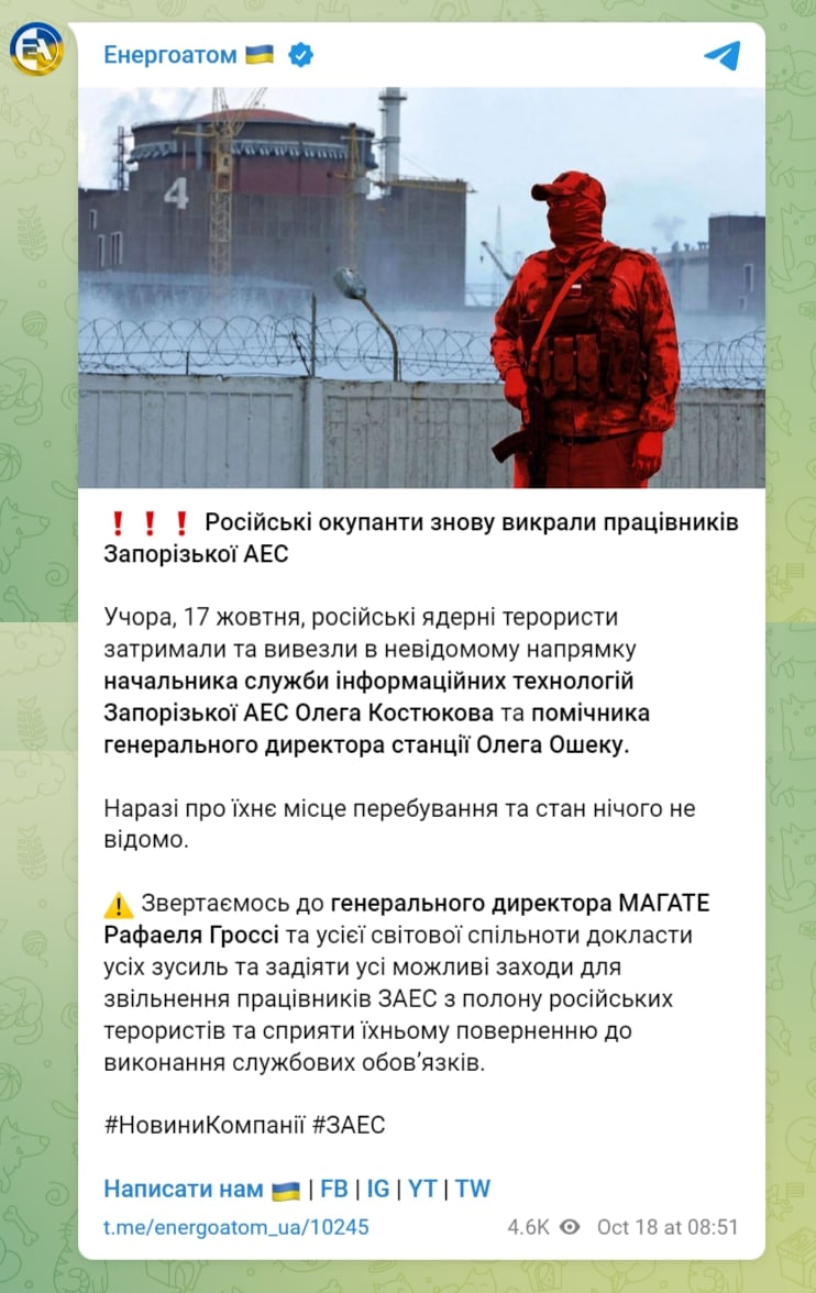 Позже "Энергоатом" сообщил о похищении замдиректора ЗАЭС по персоналу. О его судьбе пока ничего неизвестно.