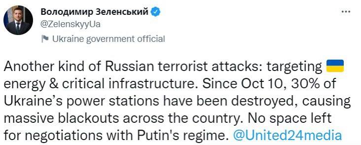 "С 10 октября 30% украинских электростанций были разрушены, что привело к массовым отключениям электроэнергии по всей стране. Не осталось пространства для переговоров с путинским режимом", – написал он.