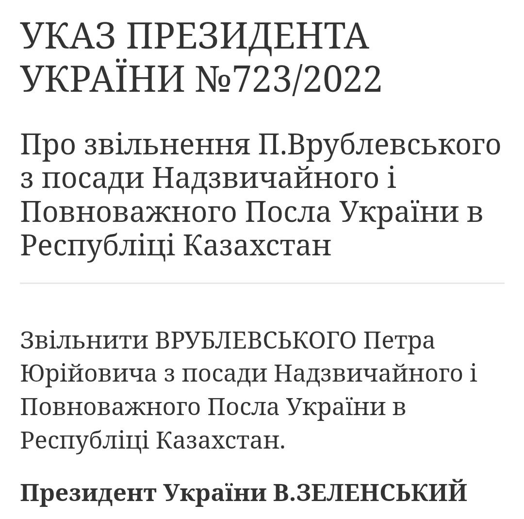 В начале октября Казахстан заявил, что Врублевский покинет страну. При этом с Украиной был договор, что она сама отзовет посла (то есть его не станут выдворять решением властей Казахстана).