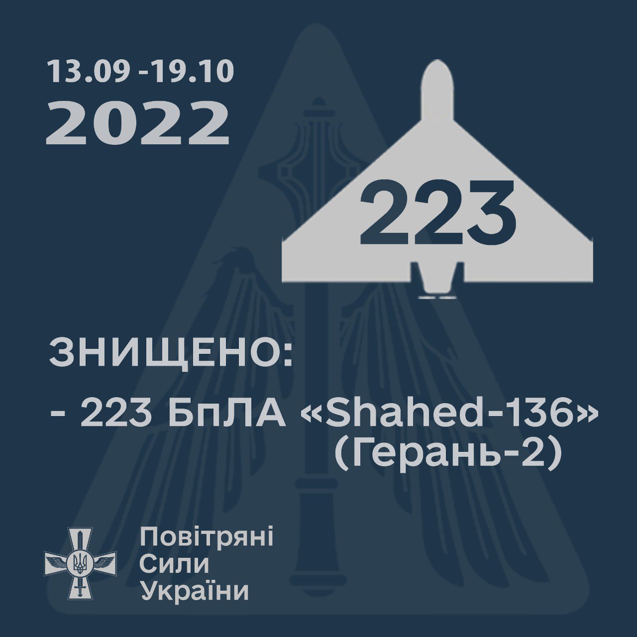 "По состоянию на 19 октября, с первого случая сбивания на территории Украины дрона-камикадзе иранского производства "Shahed-136" (13 сентября 2022 года, г. Купянск), противовоздушной обороной Воздушных сил и других составляющих Сил обороны Украины уничтожено 223 БпЛА этого типа", - сообщает командование Воздушных сил.