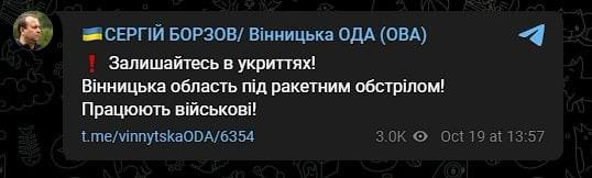 "Оставайтесь в укрытиях! Винницкая область под ракетным обстрелом! Работают военные!" - написал Борзов в своем телеграм-канале.