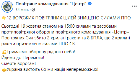 Сегодня 19 октября по состоянию на 15:00 силами и средствами противовоздушной обороны Украины сбиты 12 вражеских воздушных целей.