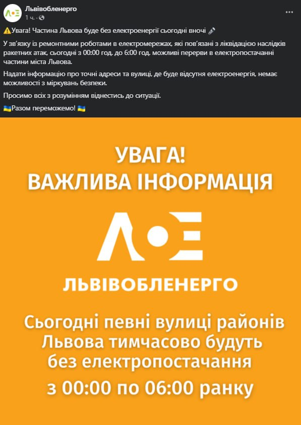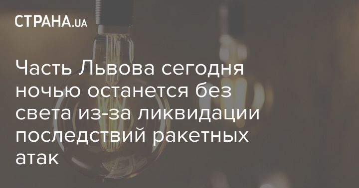 "В связи с ремонтными работами в электросетях, связанных с ликвидацией последствий ракетных атак, сегодня с 00:00 до 6:00 возможны перерывы в электроснабжении части Львова. Предоставить информацию о точных адресах и улицах, где отсутствует электроэнергия, нет возможности по соображениям безопасности", - говорится в сообщении.
