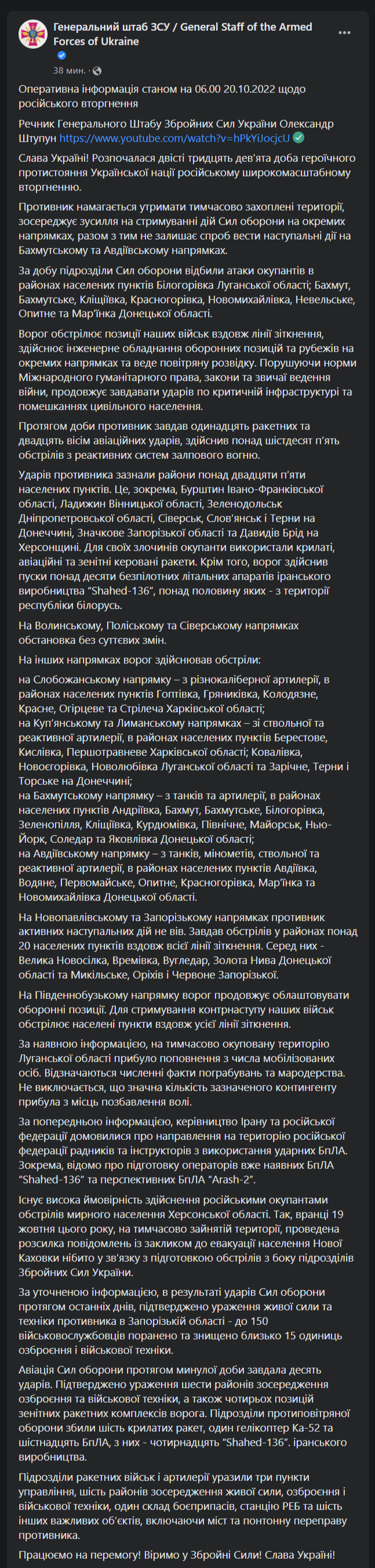 Утром в четверг, 20 октября, Генштаб ВСУ опубликовал актуальную сводку о ситуации на фронте. Сообщается, что за сутки ВСУ отразили ряд атак противника: в Луганской области - на Белогоровку, в Донецкой - на Бахмут, Бахмутское, Кдещеевку, Красногоровку, Новомихайловку, Невельское, Опытное и Марьинку.