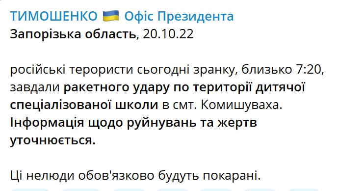 Утром в четверг, 20 октября, российские войска нанесли ракетный удар по территории детской спецшколы в Камышевахе Запорожской области.