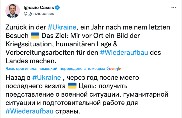 "Снова в Украине спустя год после моего последнего визита. Цель: получить представление о военной и гуманитарной ситуации и подготовительной работе для восстановления страны", - написал он в Twitter.