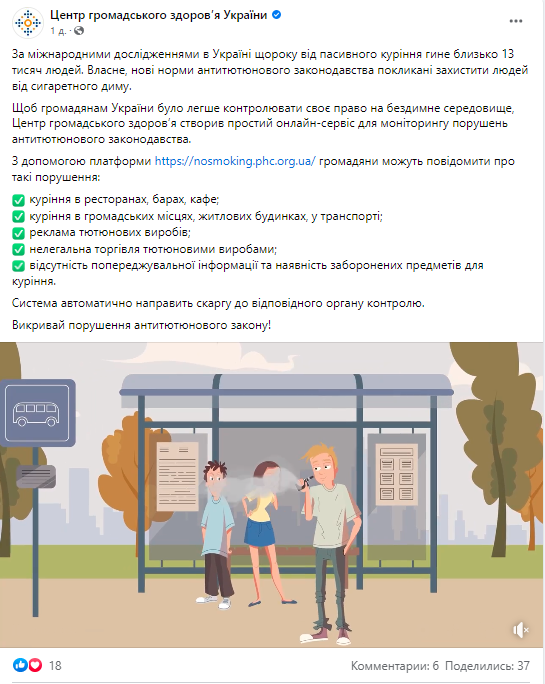 "По сути, новые нормы антитабачного законодательства призваны защитить людей от сигаретного дыма. Чтобы гражданам Украины легче было контролировать свое право на бездымную среду, Центр общественного здоровья создал простой онлайн-сервис для мониторинга нарушений антитабачного законодательства", - пишут в ЦОЗ.
