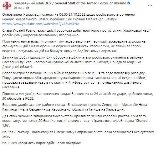 Утром 21 октября Генштаб Вооруженных Сил Украины обнародовал сводку о ситуации на фронте.