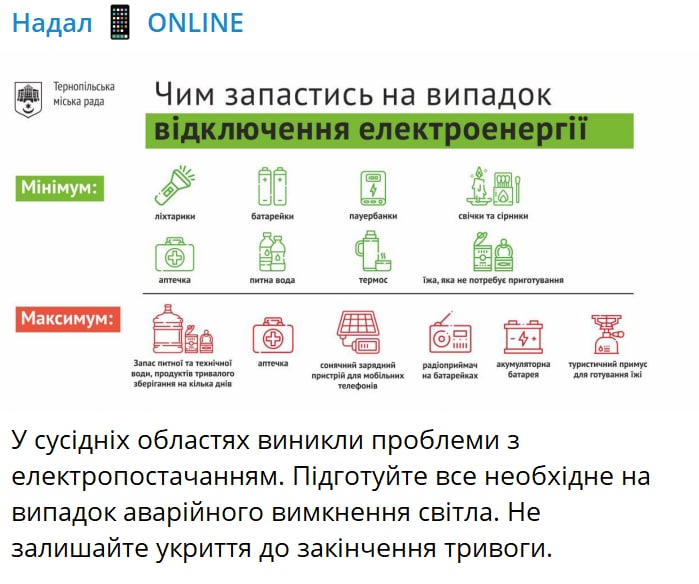 Городской голова Тернополя Сергей Надал сообщил, что в соседних областях пропал свет и призвал готовиться к аварийным отключениям.