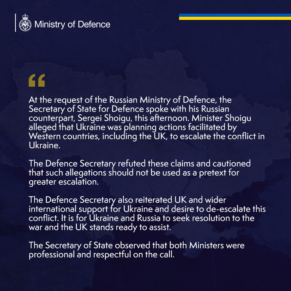 16:50 Министр обороны РФ Сергей Шойгу созвонился с третьим за сегодня коллегой из НАТО - военным министром Британии Беном Уоллесом.