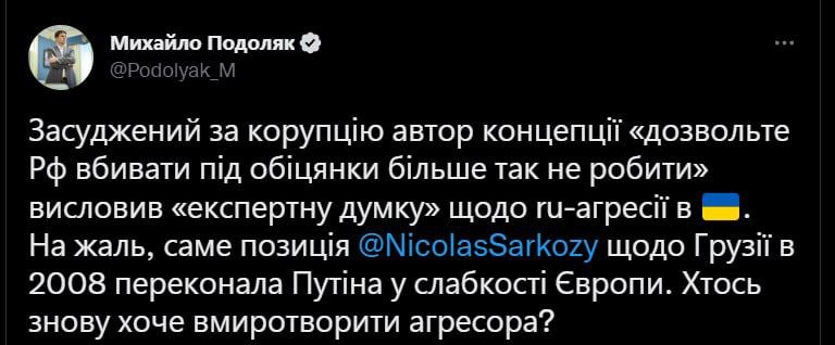 "Осужденный за коррупцию автор концепции "позвольте России убивать под обещания больше так не делать" выразил "экспертную мысль" по поводу ru-агрессии в Украине. К сожалению, именно позиция Николя Саркози  по отношению к Грузии в 2008 убедила Путина в слабости Европы. Кто-то снова хочет умиротворить агрессора?", - написал Подоляк в твиттере.