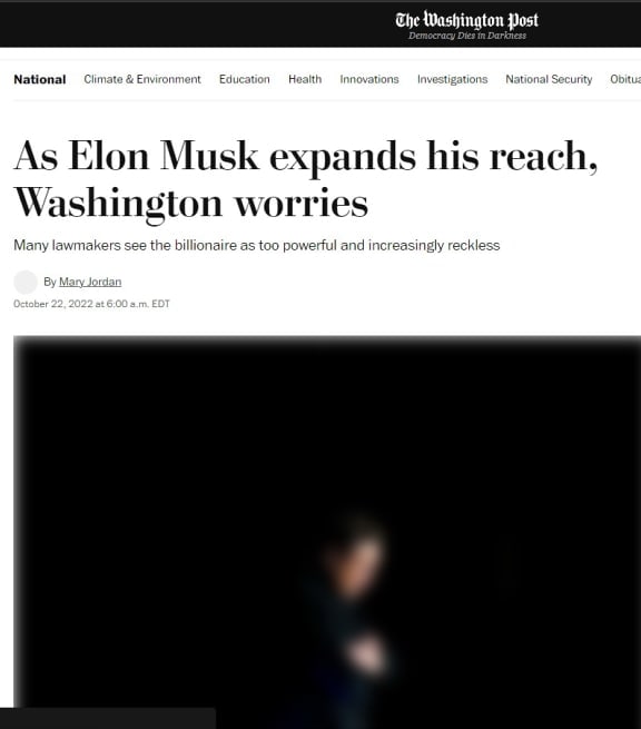 Несмотря на то, что деятельность Маска помогает Америке держать технологическое лидерство в мире. Но симпатии у руководства США к нему нет. С другой стороны, несмотря на свою колоссальную финансовую независимость, Маск тоже не может вполне игнорировать правительство, которое весьма обеспокоено его акциями, пишет автор статьи Мэри Джордан.