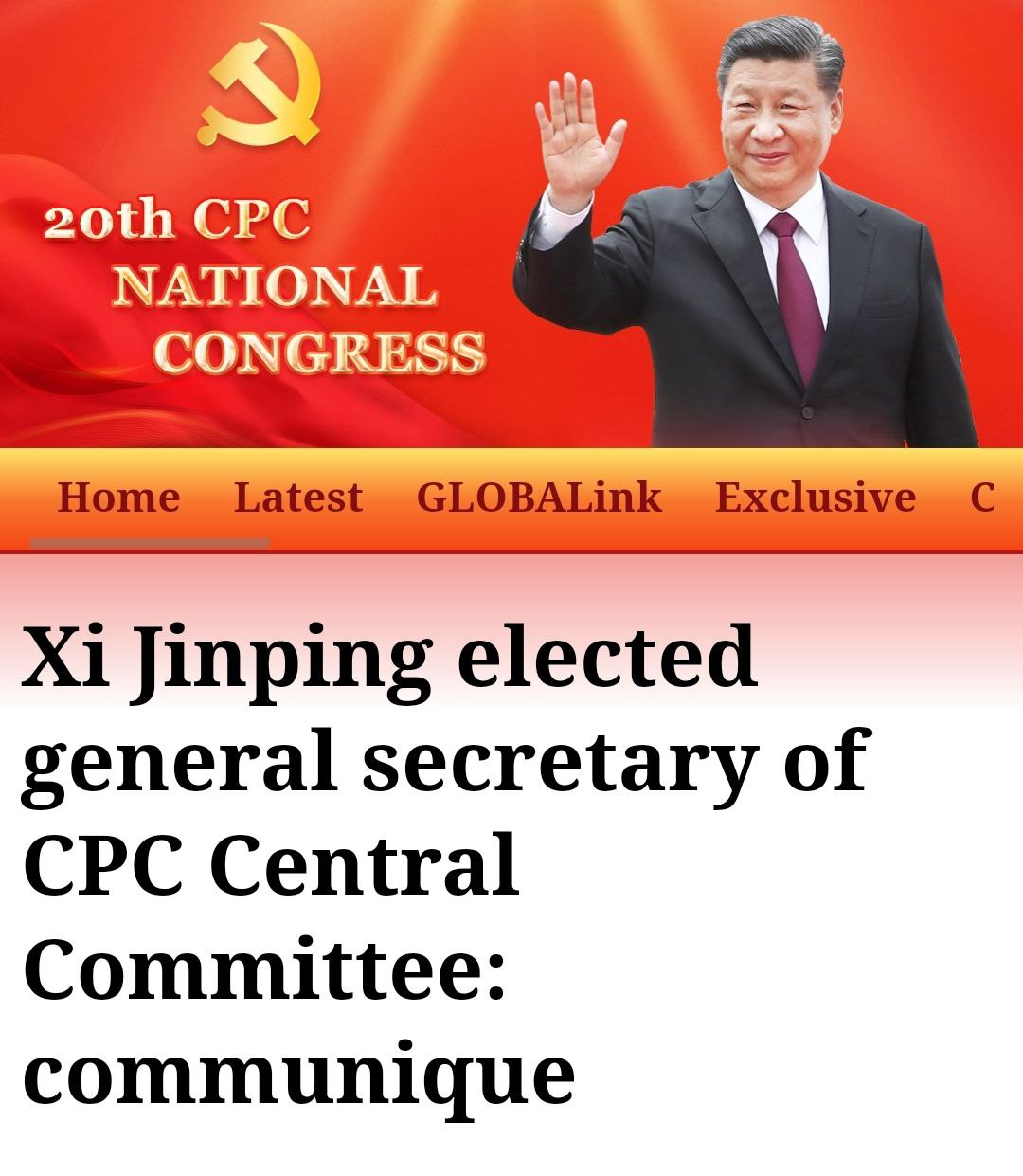 Центральный комитет Коммунистической партии Китая (ЦК КПК) 20-го созыва переизбрал Си Цзиньпина генеральным секретарем ЦК КПК на третий срок. Си Цзиньпин также в третий раз подряд занял должность председателя Военного совета ЦК КПК.