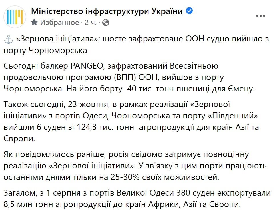 "Шестое зафрахтованное ООН судно вышло из порта Черноморска. Сегодня балкер PANGEO, зафрахтованный Всемирной продовольственной программой ООН, вышел из Черноморского порта. На его борту 40 тысяч тонн пшеницы для Йемена. Также сегодня, 23 октября, в рамках реализации "зерновой инициативы" из портов Одессы, Черноморска и порта "Южный" вышли 6 судов с 124,3 тысячами тонн агропродукции для стран Азии и Европы. Как сообщалось ранее, Россия сознательно задерживает полноценную реализацию "зерновой инициативы". В этой связи порты работают в последние дни только на 25-30% своих возможностей", - сказано в записи министерства.