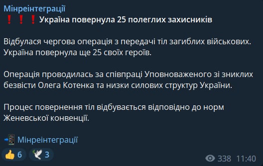 Украина во вторник, 25 октября, вернула тела 25 погибших военнослужащих.