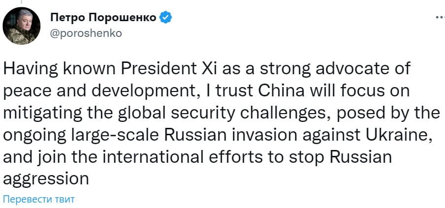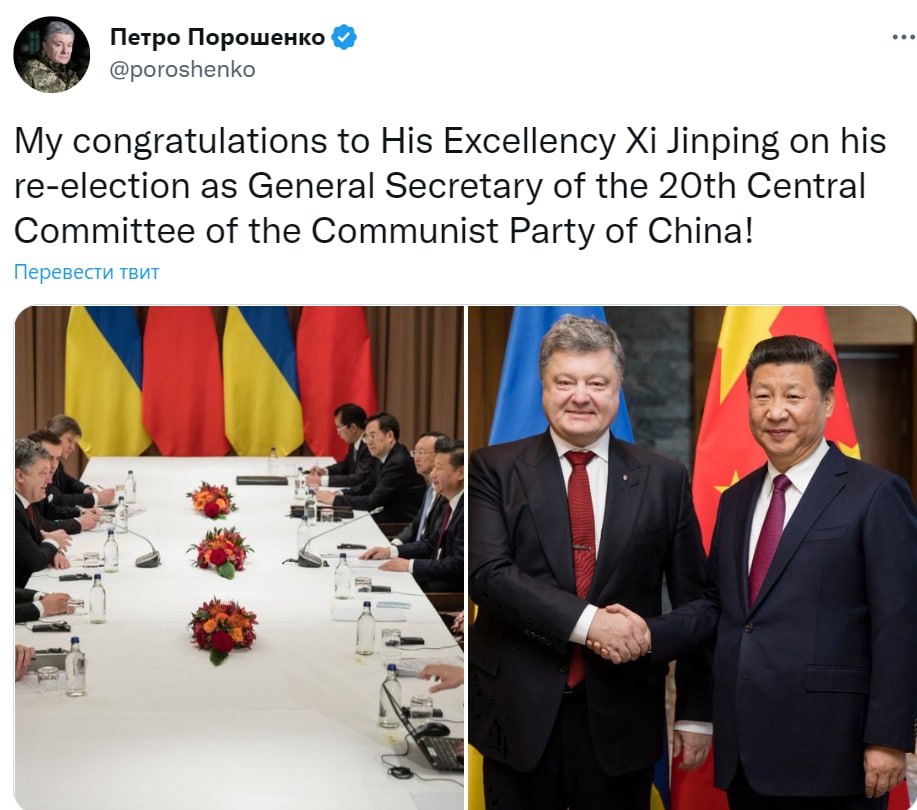 Петр Порошенко, похоже, стал единственным действующим украинским политиком, который поздравил с переизбранием главу Китая Си Цзиньпина.