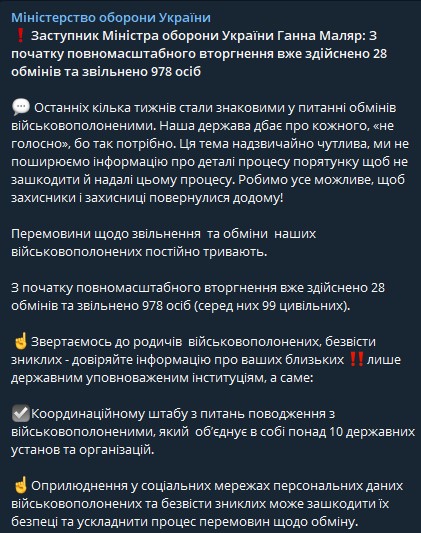 С начала российского вторжения в Украину было проведено 28 обменов пленными. В результате, наша страна освободила из российского плена 978 человек, в том числе 99 гражданских.