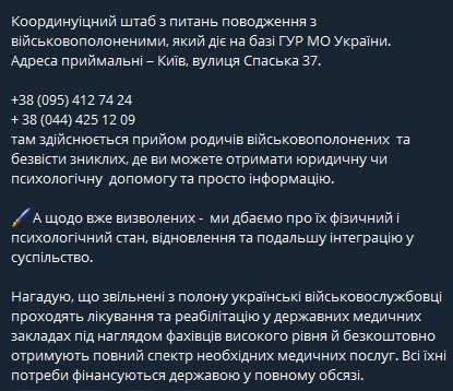 Кроме того, она сказала, что "освобожденные из плена украинские военнослужащие проходят лечение и реабилитацию в государственных медучреждениях под наблюдением специалистов высокого уровня и бесплатно получают полный спектр необходимых медицинских услуг".