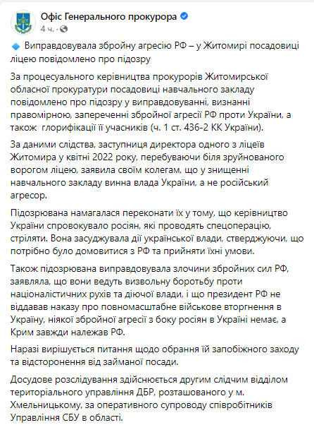 "По данным следствия, заместитель директора одного из лицеев Житомира в апреле 2022 года, находясь возле разрушенного врагом лицея, заявила своим коллегам, что в уничтожении учебного заведения виноваты власти Украины, а не российский агрессор. Подозреваемая пыталась убедить их в том, что руководство Украины спровоцировало россиян, которые проводят "спецоперацию", стрелять. Она осуждала действия украинской власти, утверждая, что нужно было договориться с РФ и принять их условия", — говорится в сообщении.