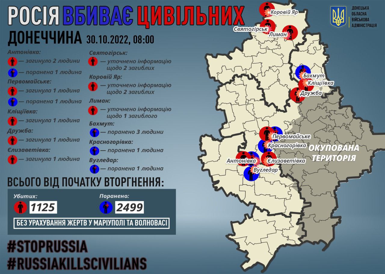 "За 29 октября стало известно о пяти мирных жителях Донбасса, убитых россиянами: в Антоновке, Первомайском, Дружбе, Клещиевке и Елизаветовке. Еще восемь человек за вчера получили ранения", - написал он.
