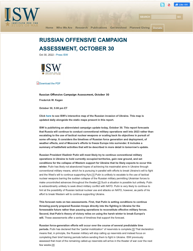 Американский Институт изучения войны полагает, что Россия продолжит проводить обычные военные операции вплоть до 2023 года, а применение тактического ядерного оружия на данный момент маловероятно.