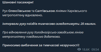 Движение всех трех линий харьковского метро возобновлено. В частности, возобновлено движение Алексеевской, Салтовской и Холодногорско-заводской линиями метрополитена.