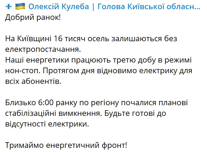9:12 Губернатор Киевской области Кулеба призвал быть готовыми к отключениям электричества.
