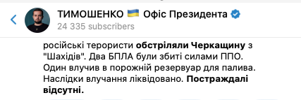 Единственный беспилотник, долетевший этой ночью до цели, попал по пустому топливному резервуару в Черкасской области.