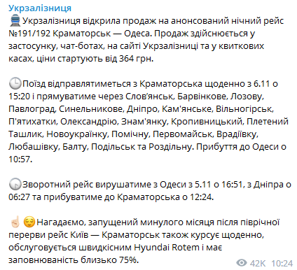 Обратный рейс будет отправляться из Одессы с 5 ноября в 16:51, из Днепра в 06:27 и прибывать в Краматорск в 12:24.