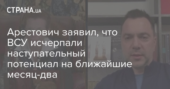 Советник Офиса президента Алексей Арестович в интервью "LatyninaTV” сообщил, что на данный момент украинская армия исчерпала наступательный потенциал, не имея запасов западного вооружения для того, чтобы в ближайшие время создать наступательные операции по типу Харьковской.