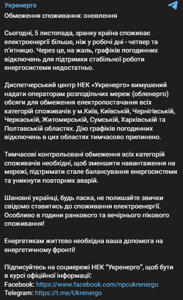 "Диспетчерский центр НЭК "Укрэнерго" вынужден предоставить операторам распределительных сетей (облэнерго) объемы для ограничения электроснабжения всех категорий потребителей в Киеве, Киевской, Черниговской, Черкасской, Житомирской, Сумской, Харьковской и Полтавской областях. Действие графиков почасовых отключений в этих областях временно прекращено", - говорится в сообщении.