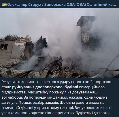 В ночь с 5 на 6 ноября российские войска нанесли ракетный удар по Запорожью. В результате разрушено двухэтажное здание коммерческого предприятия. Там был масштабный пожар.