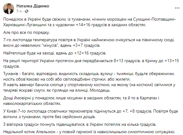 Об этом сообщает синоптик Наталья Диденко в своем Facebook.