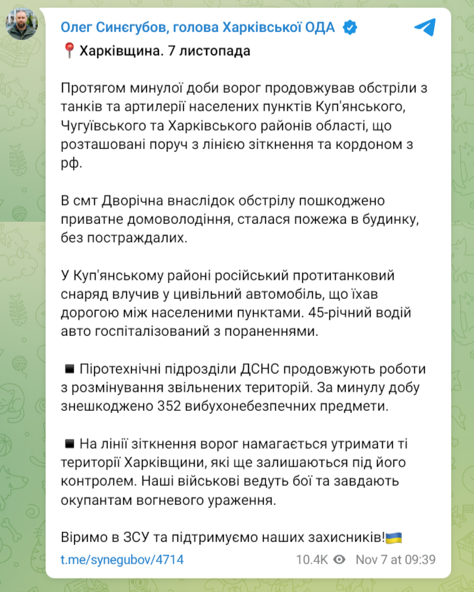 "На линии столкновения враг пытается удержать те территории Харьковщины, которые еще остаются под его контролем. Наши военные ведут бои и наносят оккупантам огневые поражения", - пишет Синегубов.