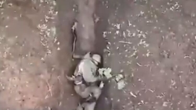 Опубликовано снятое с дрона видео, на котором предположительно российский солдат в окопе отбрасывает три сброшенные на него с беспилотника гранаты и убегает.