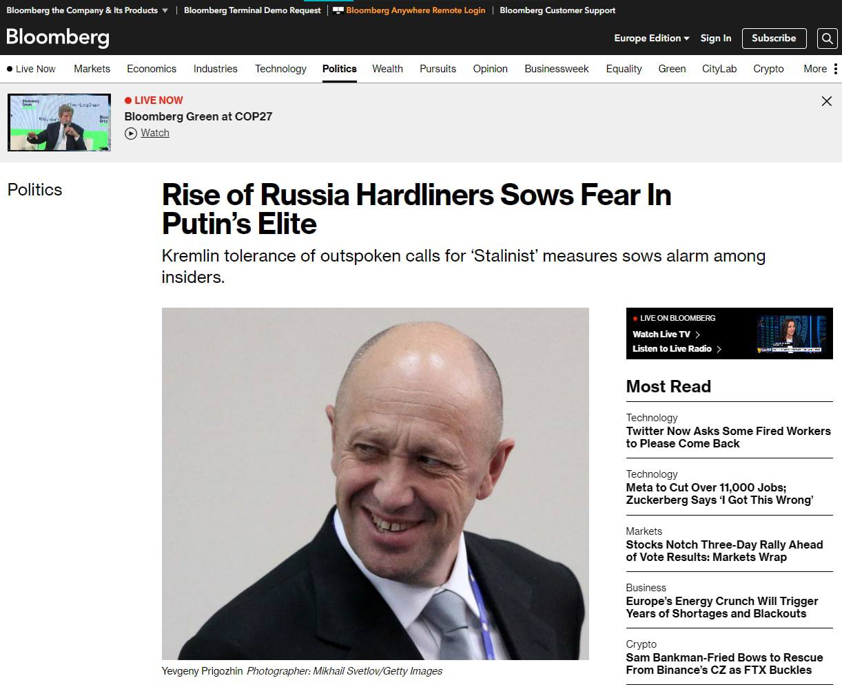 Российская элита напугана ростом влияния Пригожина и его призывами к репрессиям - Bloomberg