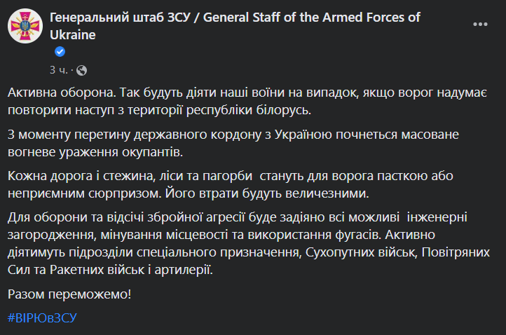 "С момента пересечения государственной границы с Украиной начнется массированное огневое поражение оккупантов. Каждая дорога и тропа, леса и холмы станут для врага ловушкой или неприятным сюрпризом. Его потери будут огромными", - сообщил Генштаб ВСУ.
