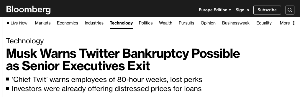 "В то время как покупка вывела Twitter из-под пристального внимания публичных рынков, Маск нагрузил компанию почти 13 миллиардами долларов долга, который сейчас находится в руках семи банков Уолл-стрит. Доверие к компании подорвано так быстро, что еще до комментариев Маска о банкротстве некоторые фонды предлагали купить кредиты всего за 60 центов за доллар - цена, которая обычно назначается компаниям, находящимся в затруднительном финансовом положении", - пишет Bloomberg.