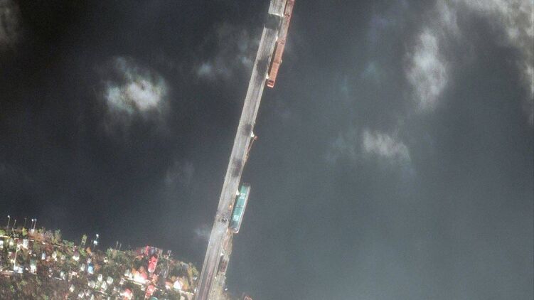 Опубликованы спутниковые снимки подорванных Антоновского (через Днепр) и Дарьевского (через Ингулец) мостов в Херсонской области.