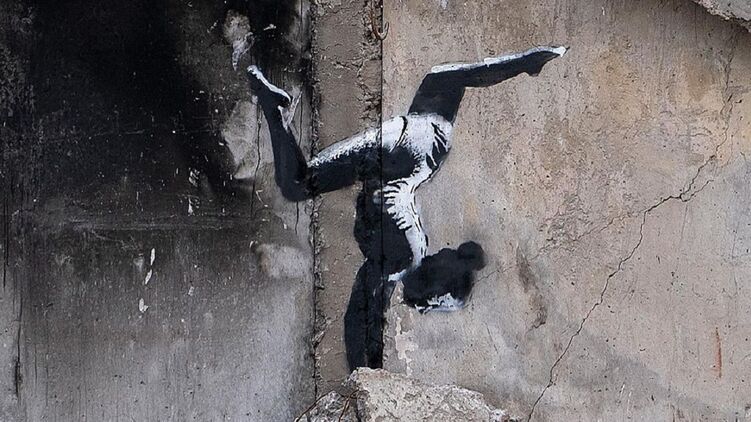 гимнастка - рисунок художника Бэнкси на стене дома в Бородянке