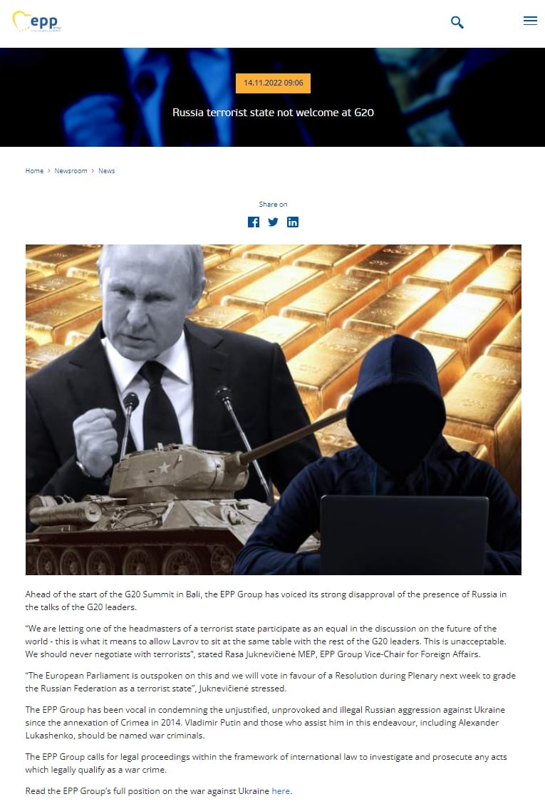 "Мы разрешаем одному из руководителей террористического государства участвовать на равных в дискуссии о будущем мира — вот что значит позволить Лаврову сесть за один стол с остальными лидерами G20. Это неприемлемо. Мы никогда не должны вести переговоры с террористами", - заявила депутат Европарламента Раса Юкнявичене (ЕНП).