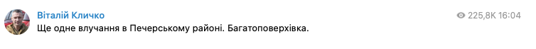 Мэр Виталий Кличко сообщает о еще одном попадании по многоэтажке в Печерском районе.